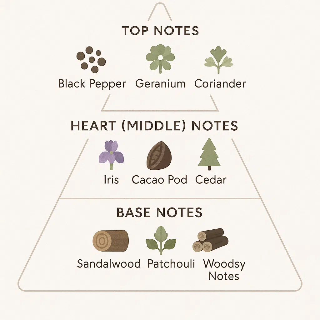 Base Notes: Woodsy Notes, Sandalwood, Patchouli